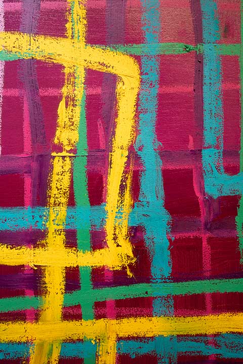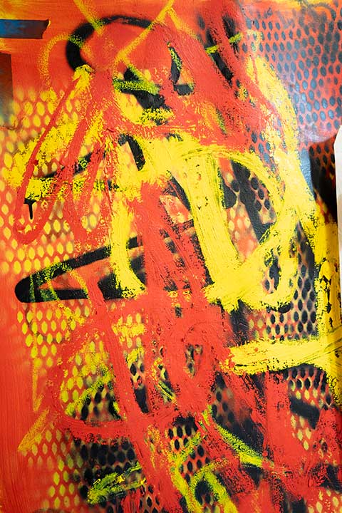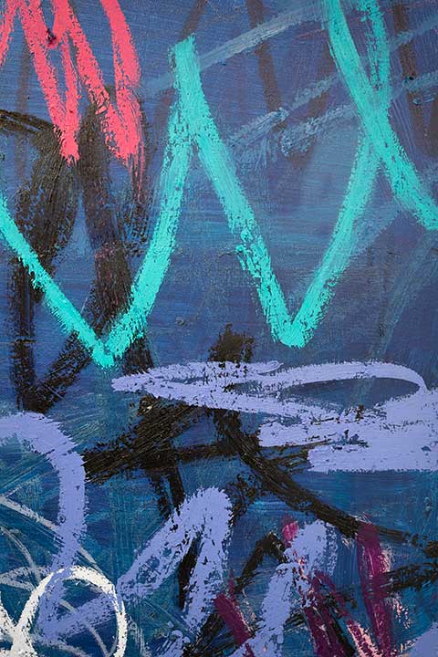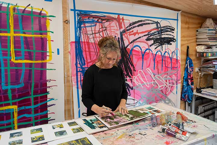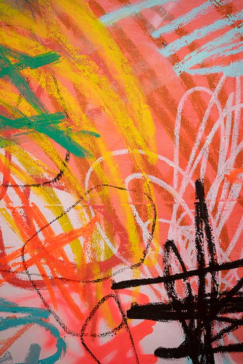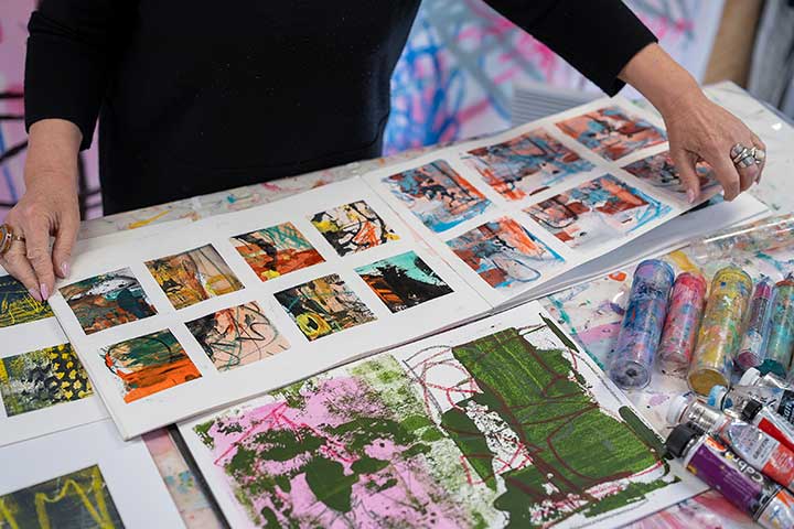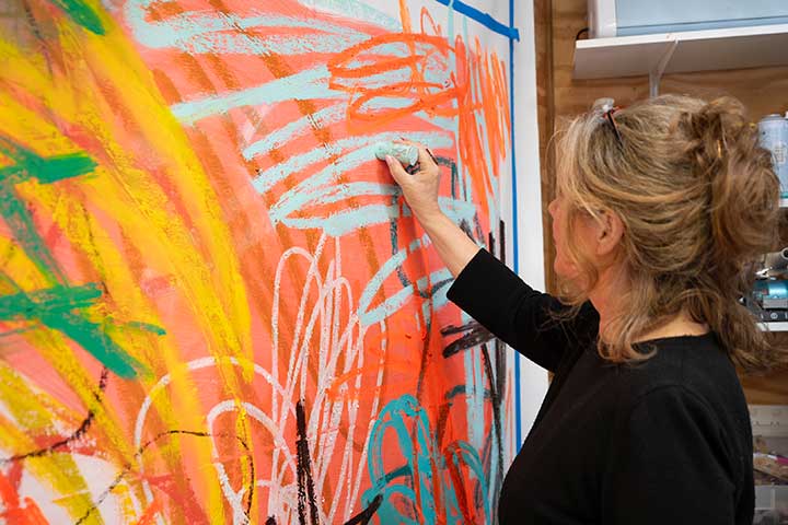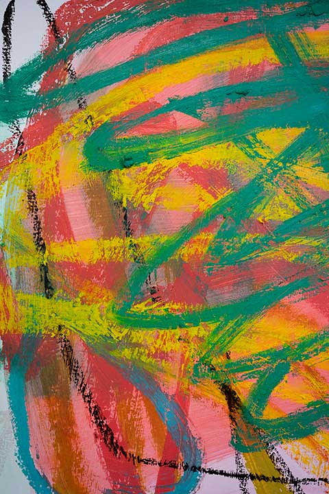 In her studio practice, Cathryn embraces a highly experimental approach, working intuitively with a variety of materials including oil paint, oil sticks, acrylic, spray paint, crayon, and collage. Much of her process begins with smaller studies on paper, allowing for open-ended exploration of colour, texture, and composition. This time of experimentation is essential, forming the foundation for her larger, more resolved works.