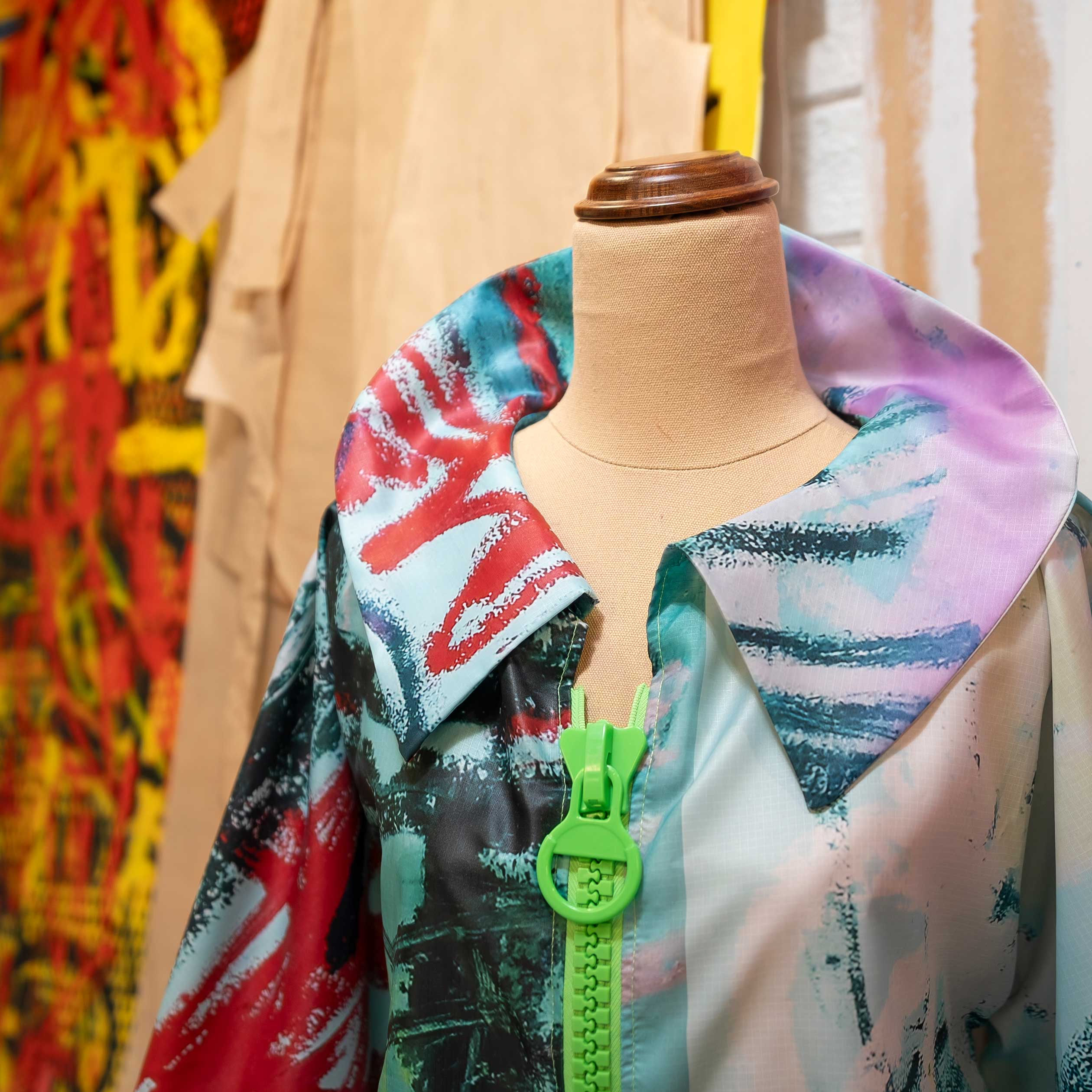Her work is a deep dive into abstraction—where colour, line, and form become language, creating vibrant, layered compositions that evoke movement, energy, and introspection. Her work also extends into textiles, blending visual art and wearable forms to create immersive, theme-driven exhibitions.