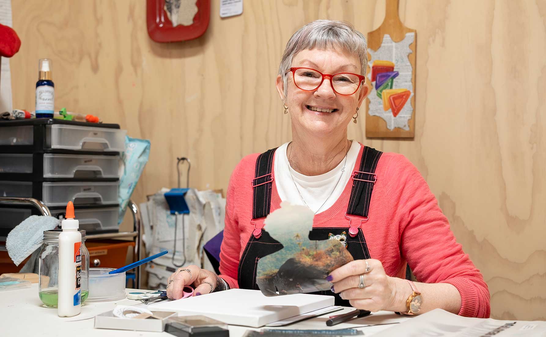 Her practice spans collage, painting, sewing, assemblage, and sculpture, using materials such as wood saws, skate decks, dolls, rocks, and recycled items for inspiration and form. Her approach is intuitive and process-driven, allowing ideas to develop organically rather than following strict plans. FeeBee works from a shared studio in Upwey and has exhibited across Melbourne and the Dandenong Ranges. She continues to explore themes of transformation, resilience, and joy through her art, while also engaging with community initiatives and collaborative projects. Her work encourages audiences to find playfulness and meaning in everyday life and to see art as a way to foster connection and conversation.