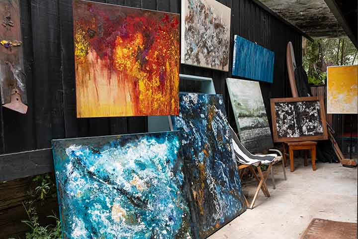 Jamie’s workspace incorporates a recording studio—an intimate environment for music creation—alongside an outdoor area where he paints. His artworks are largely created on flat surfaces and are produced outdoors, often using syringes, leaf blowers, and other unconventional tools. The space also features films and meditation music, inviting contemplation and offering an immersive visual and aural experience.