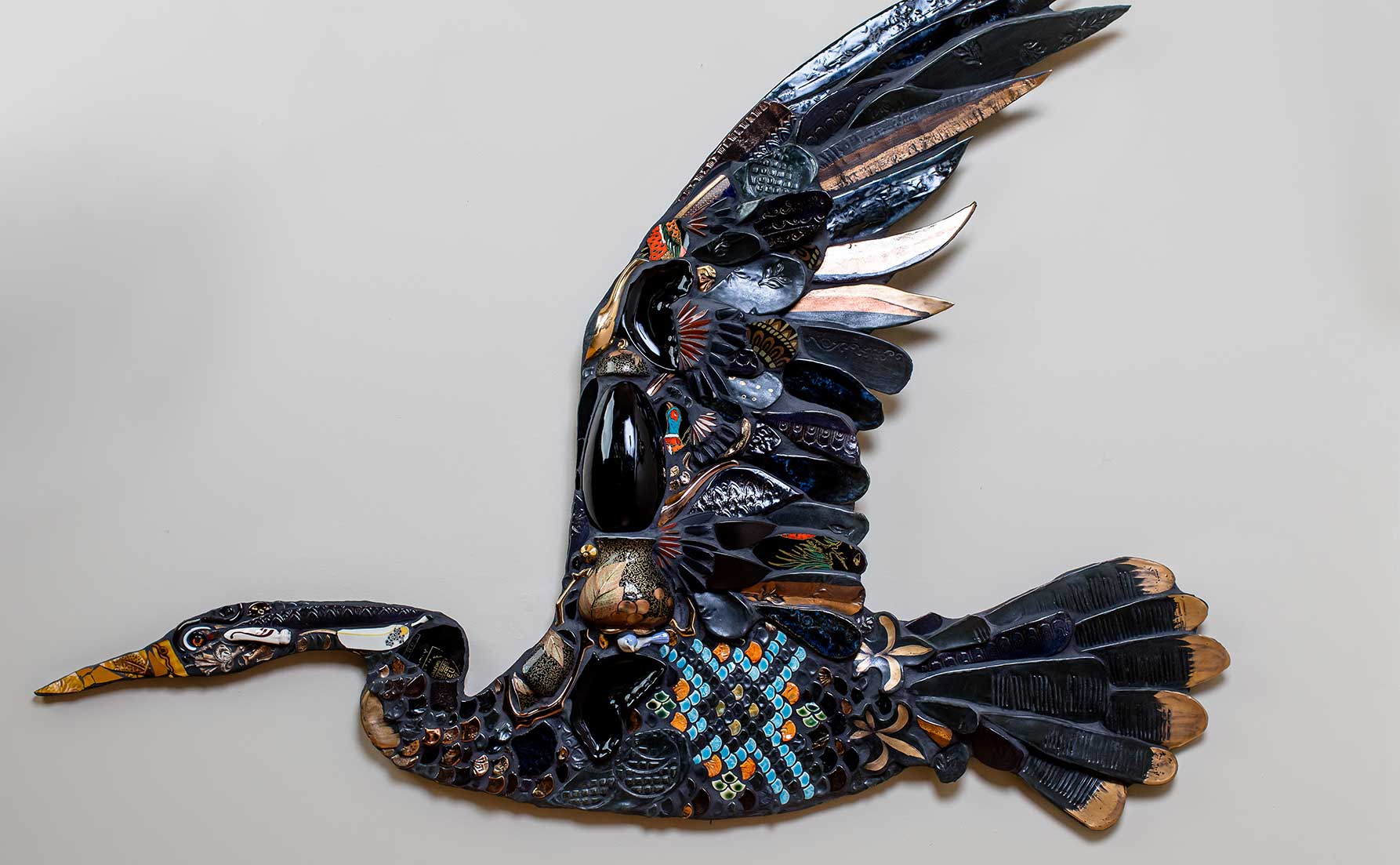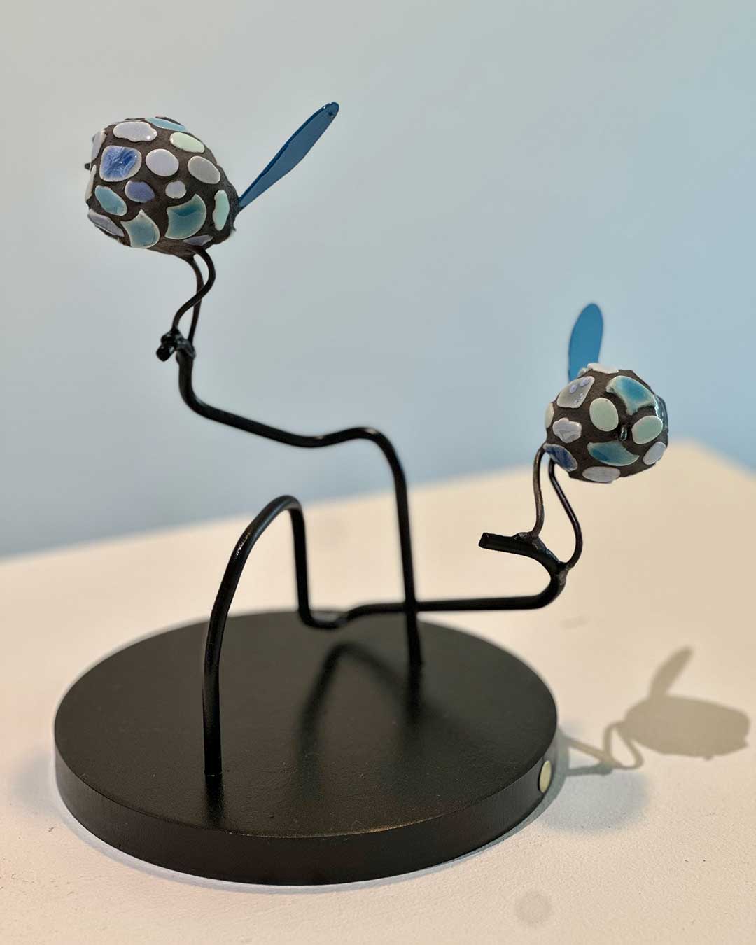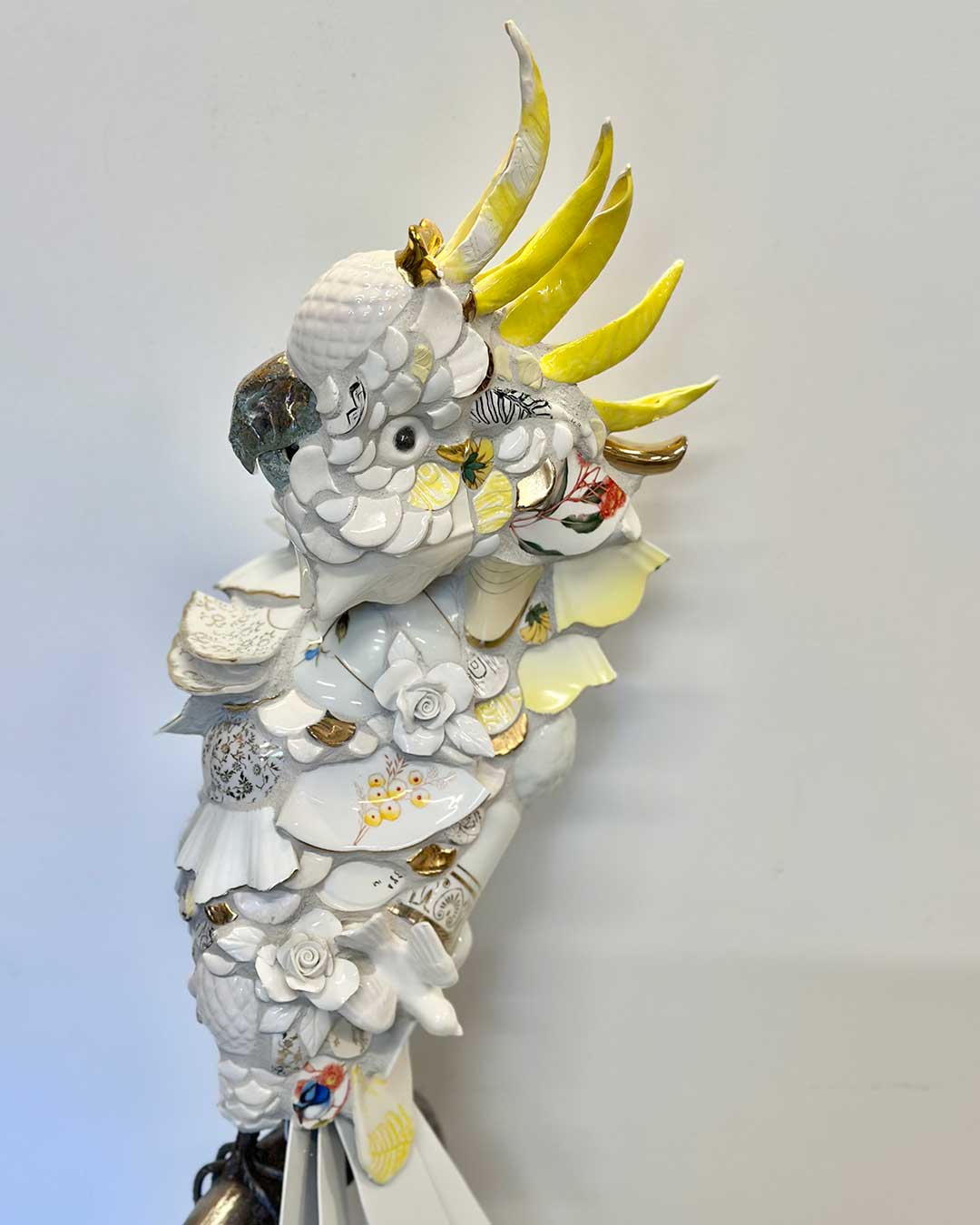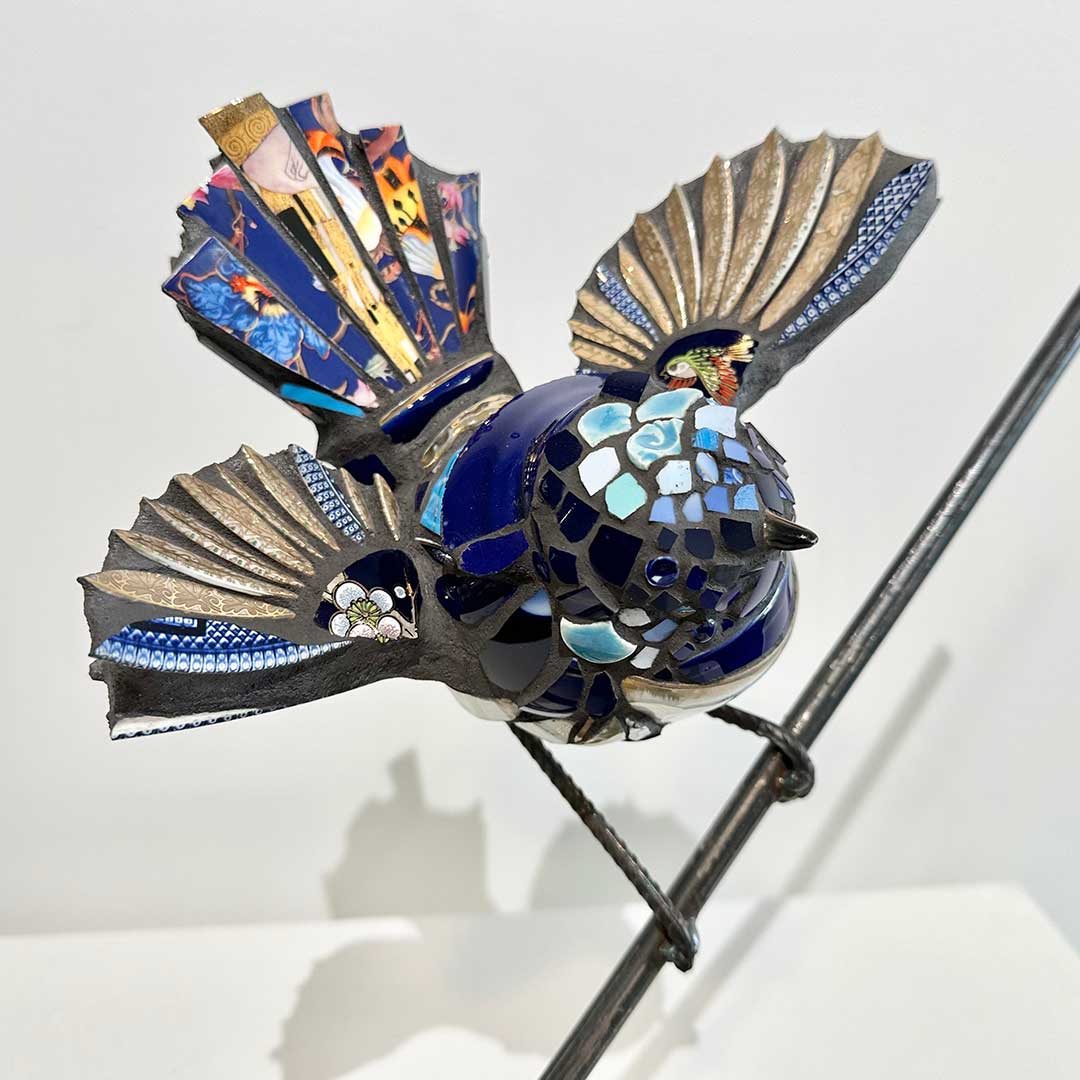 Inspired by her natural surroundings in the Hills, Jessie creates bird sculptures using her own handmade ceramics, antique ware, steel, and wax for lost-wax casting.