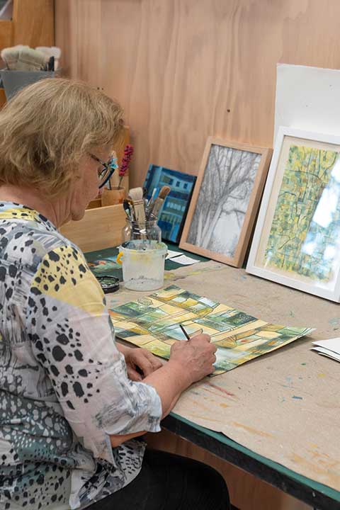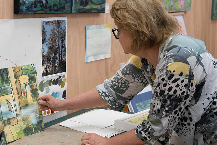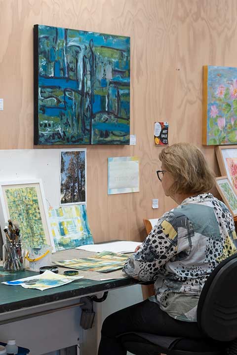Mary-Lin Litchfield is an emerging artist now enjoying creating at Studio 13 in the Aerie Collective Space art Burrinja. Mary-Lin is working on a series of paintings in the abstract. Originally developed from the premise of a bird’s eye view of the land from above– the new series includes the concept of the expanses of the sky as viewed from below.