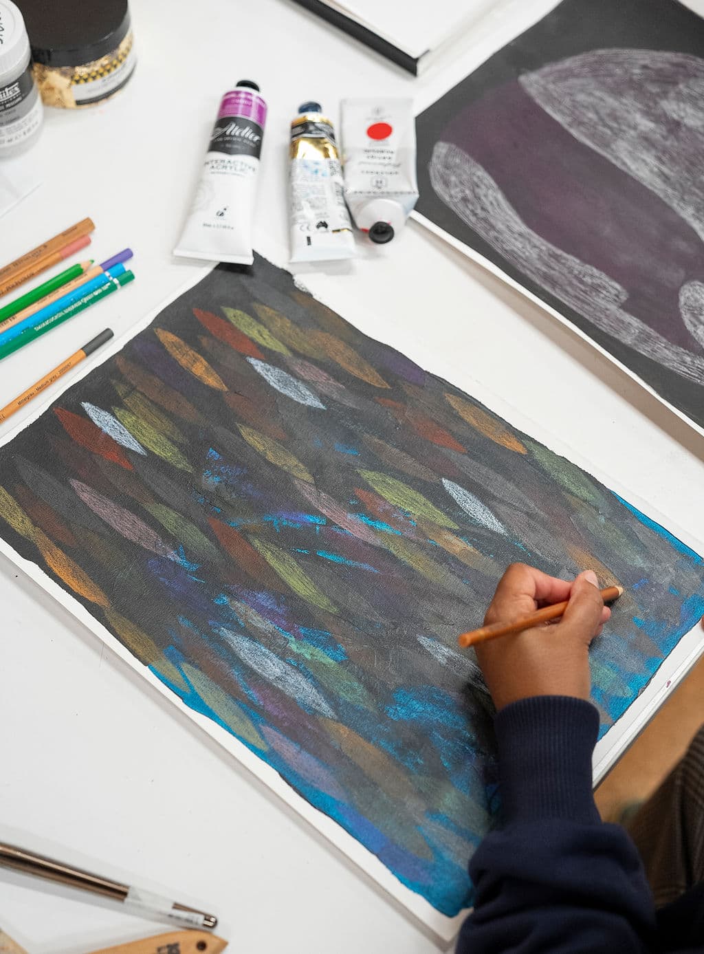 Natalie’s creative process includes abstract painting (acrylic), drawing (pastels), colouring (pencils), mark making, overlays with acrylic ink, experiments with texture mediums, and upcycling ceramics.