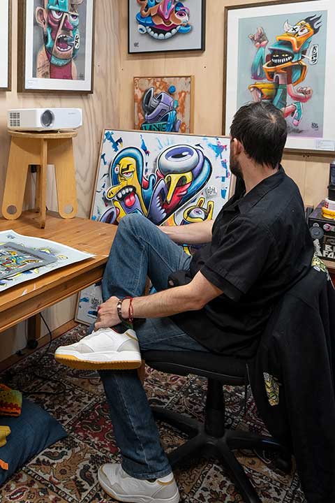 In the main studio, Skübz works primarily with paint and brush to create his paintings. Finished works are on display for visitors, alongside art prints and custom clothing representing his individual style.