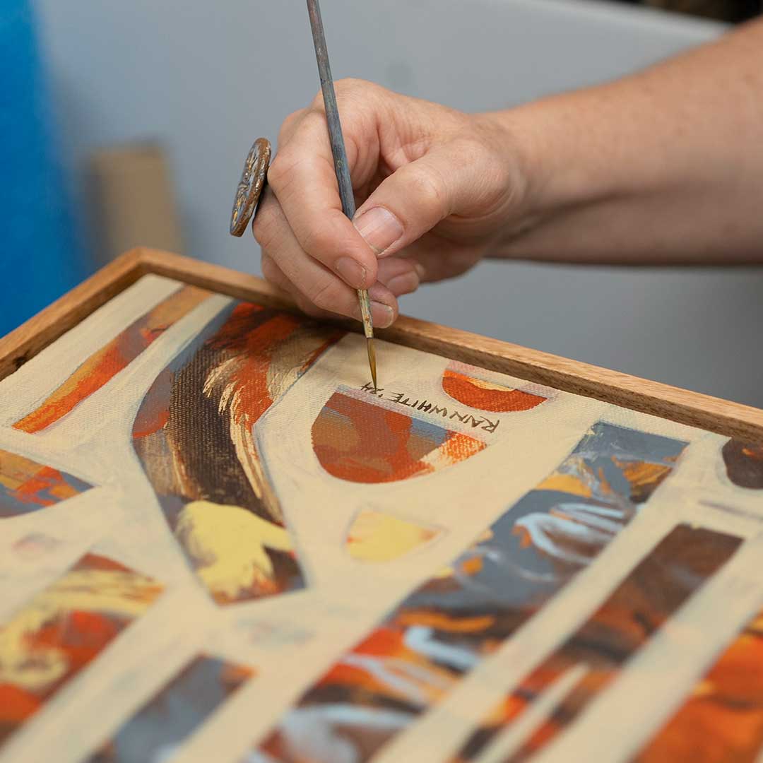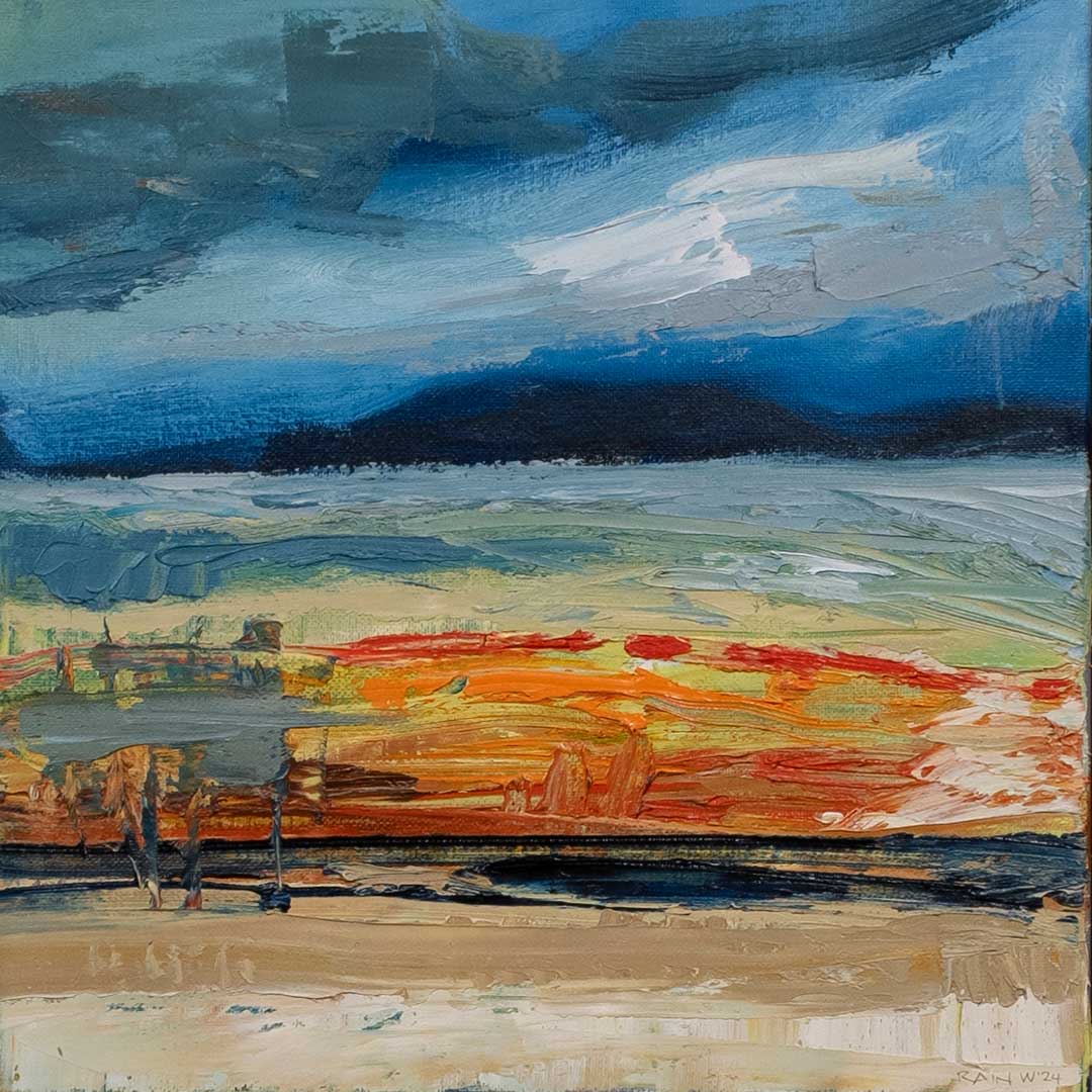 Rain visually explores landscape, symbols, and icons. By exploring and developing a unique visual language, her work encourages contemplation. She enjoys the challenge and innovation possible when working with a diverse range of media.