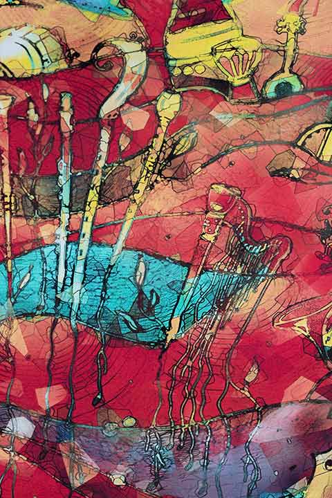 Her pencil hand-drawn illustrations are digitally embellished into rich, vibrant artworks that reflect how she synesthetically interprets music, in both figurative and abstract forms, and within natural landscapes.