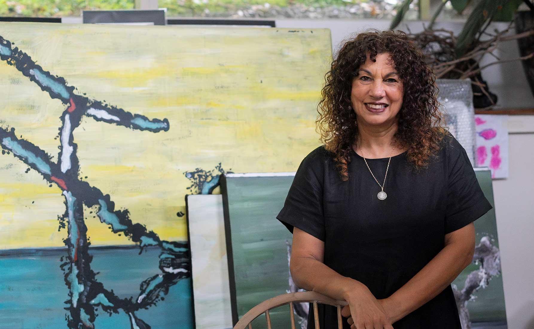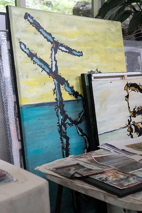Strong structural shapes, a sense of story, and a sense of drama contribute to the evocation of nature in Trish's conceptualised landscape painting.