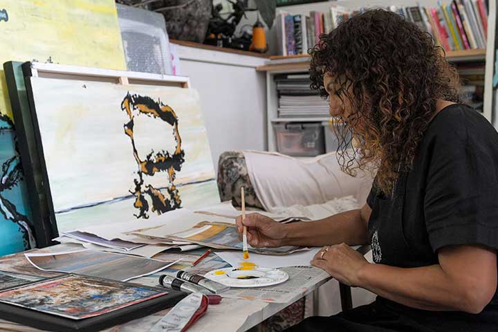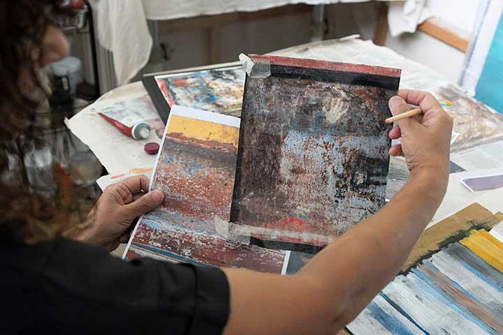“My work is a combination of painting/mixed media, printmaking and collage techniques, focusing on abstract, conceptualised landscape design. I have been experimenting more this year with collage and accidental print images from gel plate and oil transfer drawing, combined with painting on canvas. I look at man-made shapes and textures and transform them in my art to evoke a sense of nature and the natural environment, always mindful of what was placed on indigenous land. Artistic experimentation with collage, layered surfaces, intuition and using technical experience to inform the creative process is also very important in my work."
