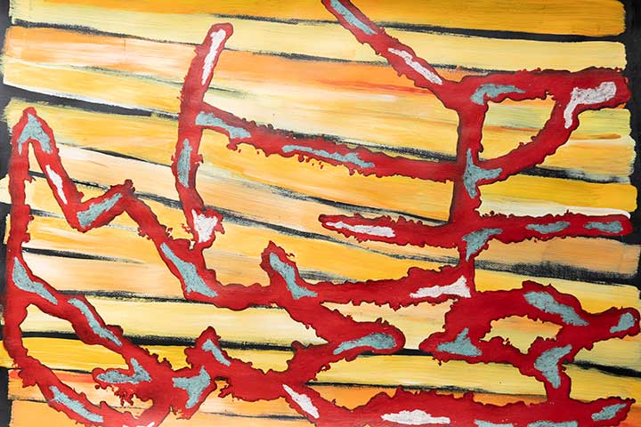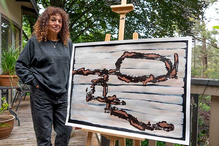 Trish’s studio is shared in collaboration with fellow artist and friend Jenny Rowe in Tecoma. Trish was the winner of the Swinburne Innovation Award at Burrinja’s Chrysalis exhibition in 2025. This work has led to further exploration of collage, oil transfer drawing and gel printing techniques. Much of Trish’s art is inspired by the surface patterns found in asphalt road marks and other manmade surfaces. These are large paintings that show strong structural shapes reinterpreted into landscape designs that invite the viewer’s imagination and evolving stories. Trish’s underlying concepts always consider the marks of human intrusion on ancient lands.
