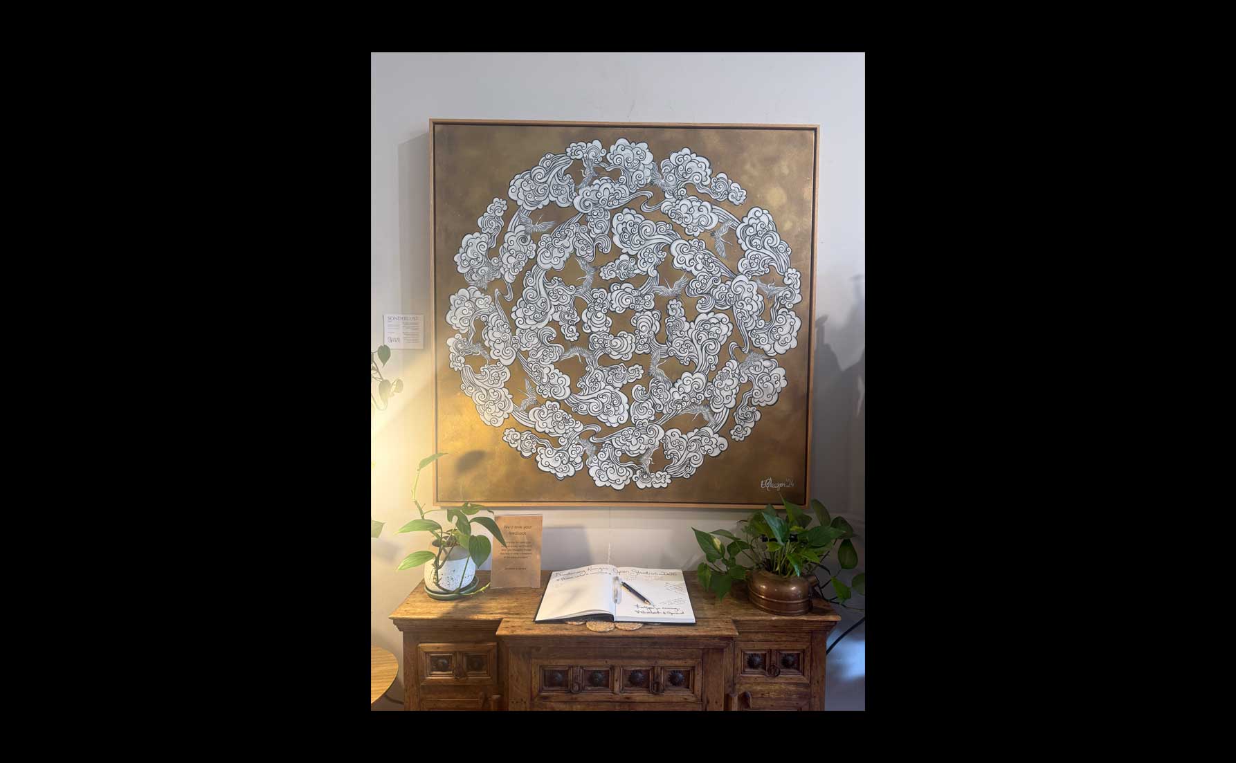 Our very first stop was the Monbulk studio of Elizabeth Gleeson and Gerard Russo. To my great relief, parking was a breeze. That immediately lowered my anxiety levels and let me focus on the experience. As we entered, we were immediately drawn to this 'paint-by-numbers' community mural set up right at the entrance. With pots of paint and brushes at the ready, Jen and I carefully stayed within the lines to make our own small contribution to this collaborative artwork. Only after this creative moment did we receive a warm welcome from Gerard. Inside the studio, Gerard’s striking charcoal drawings, used as the source for his illuminated copper pieces, were a particular highlight, showcasing a fascinating blend of technique and imagination. Elizabeth’s intricate, mandala-like artworks captivated us as well, evoking the elegance of Art Nouveau but with a refreshing, modern slant and a kaleidoscope of colour.