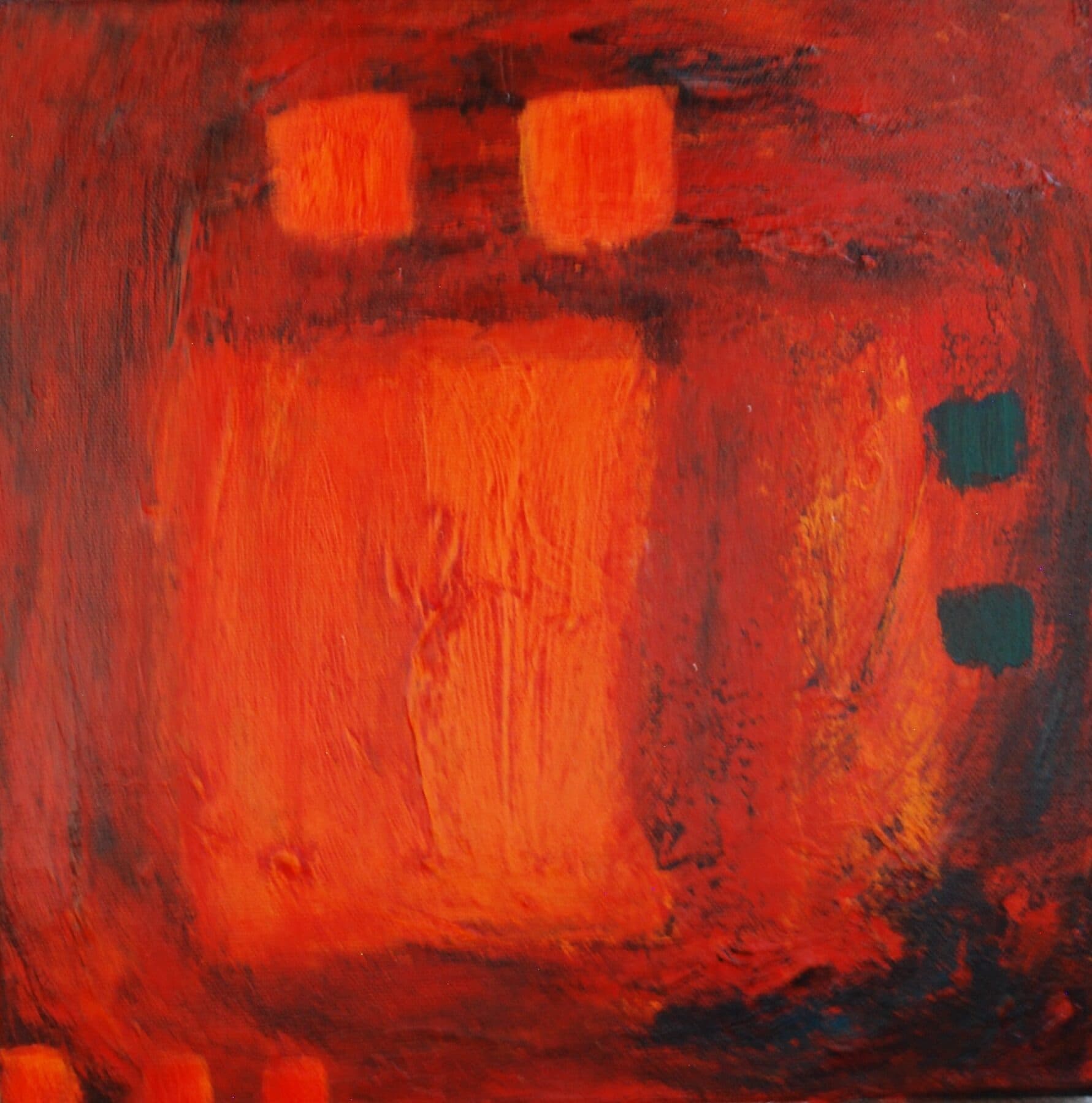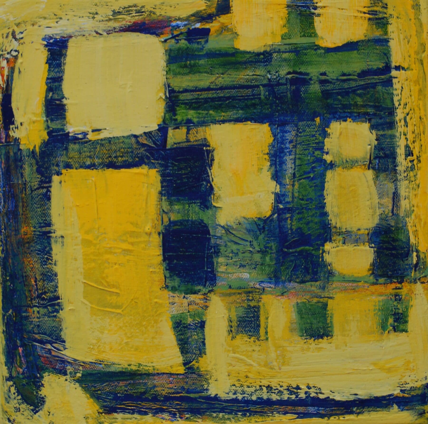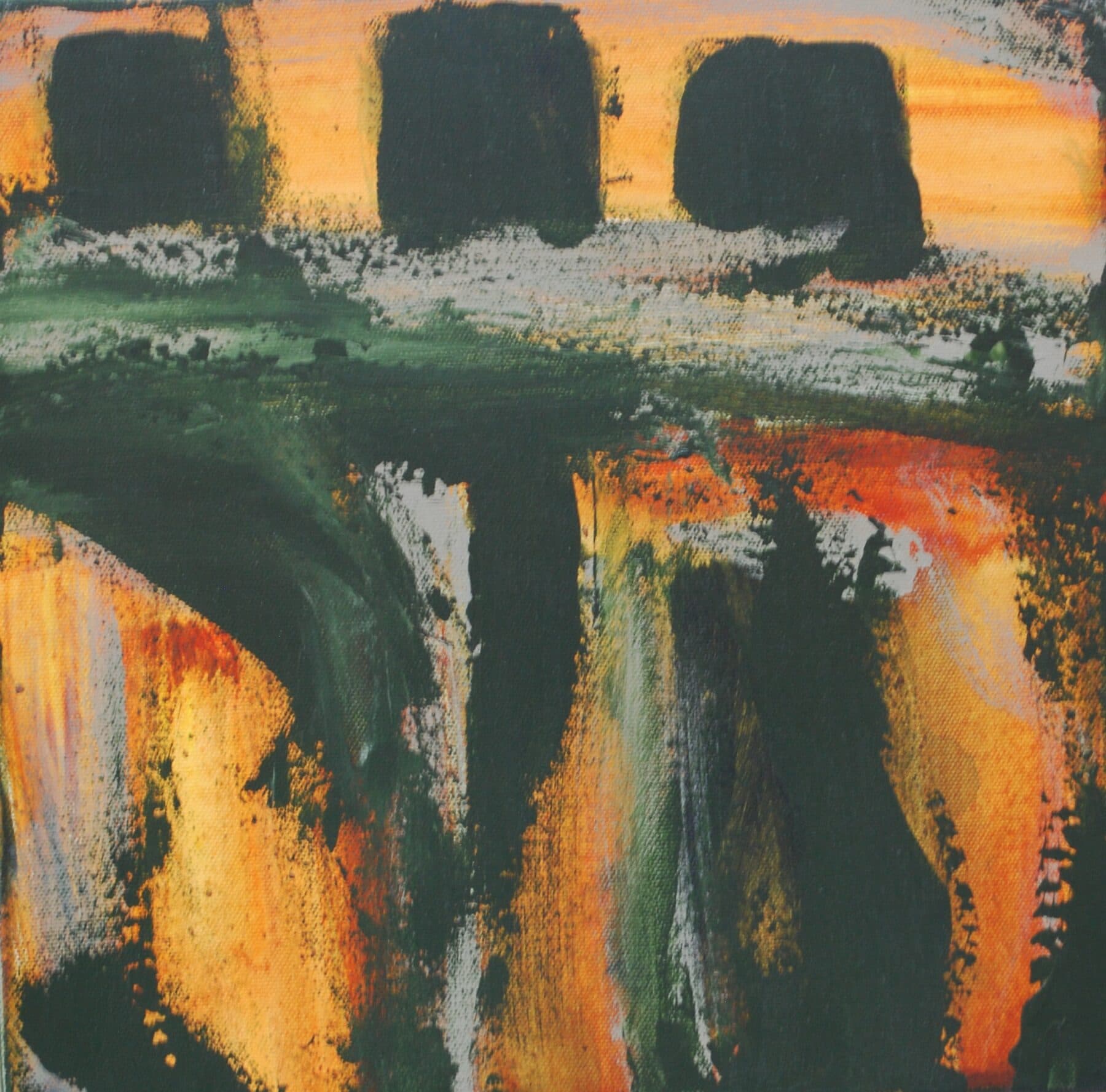 With a starting point of three small works using formative colours with strong contrast and mark-making, she expresses meaning through explorative play with texture. As these first pieces developed, both memories and a need for strength and courage flowed into the development of this body of work, as pieces increased in scale and urgency though bold, expressive brushwork.